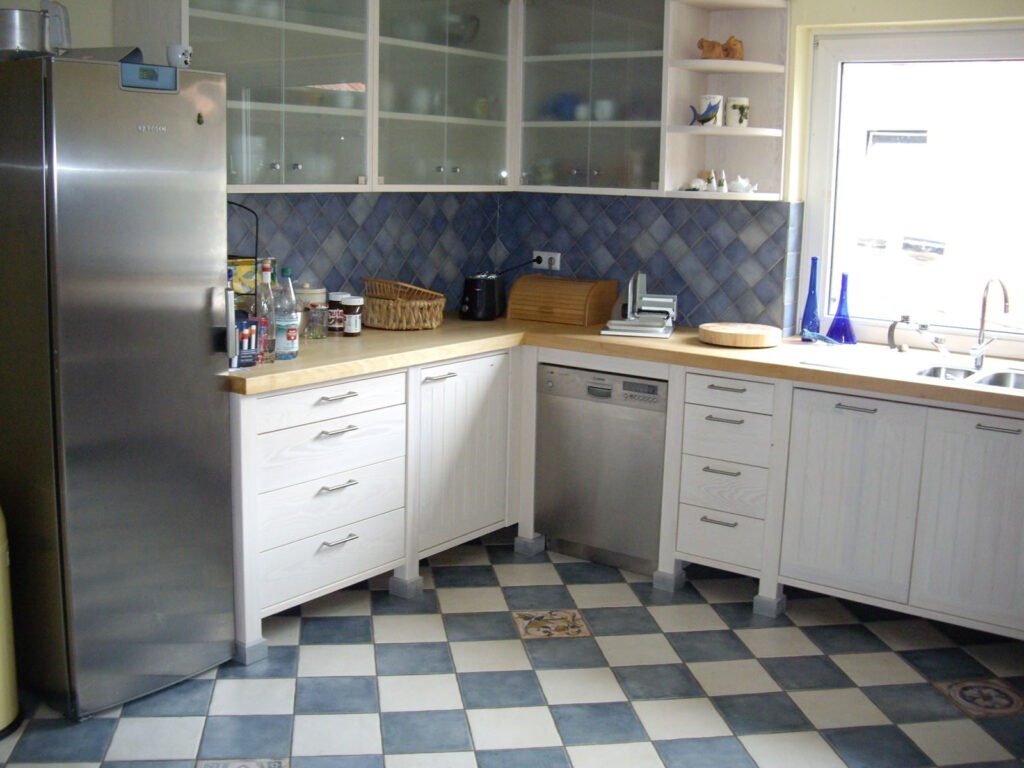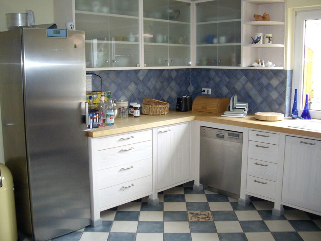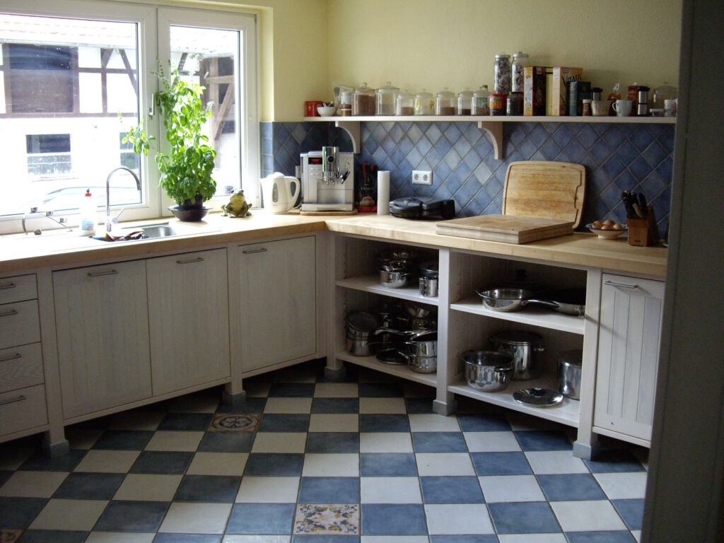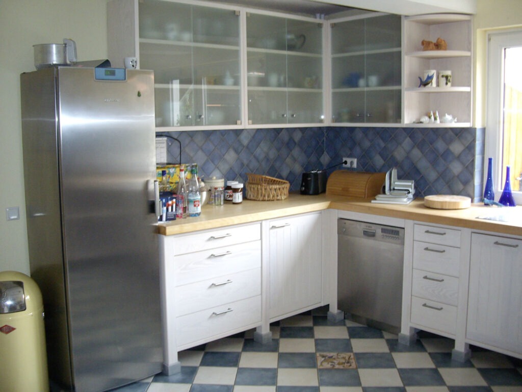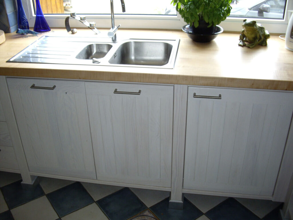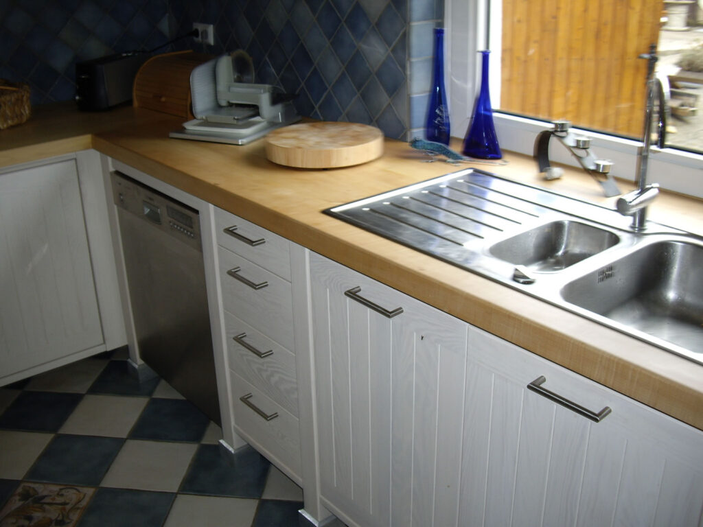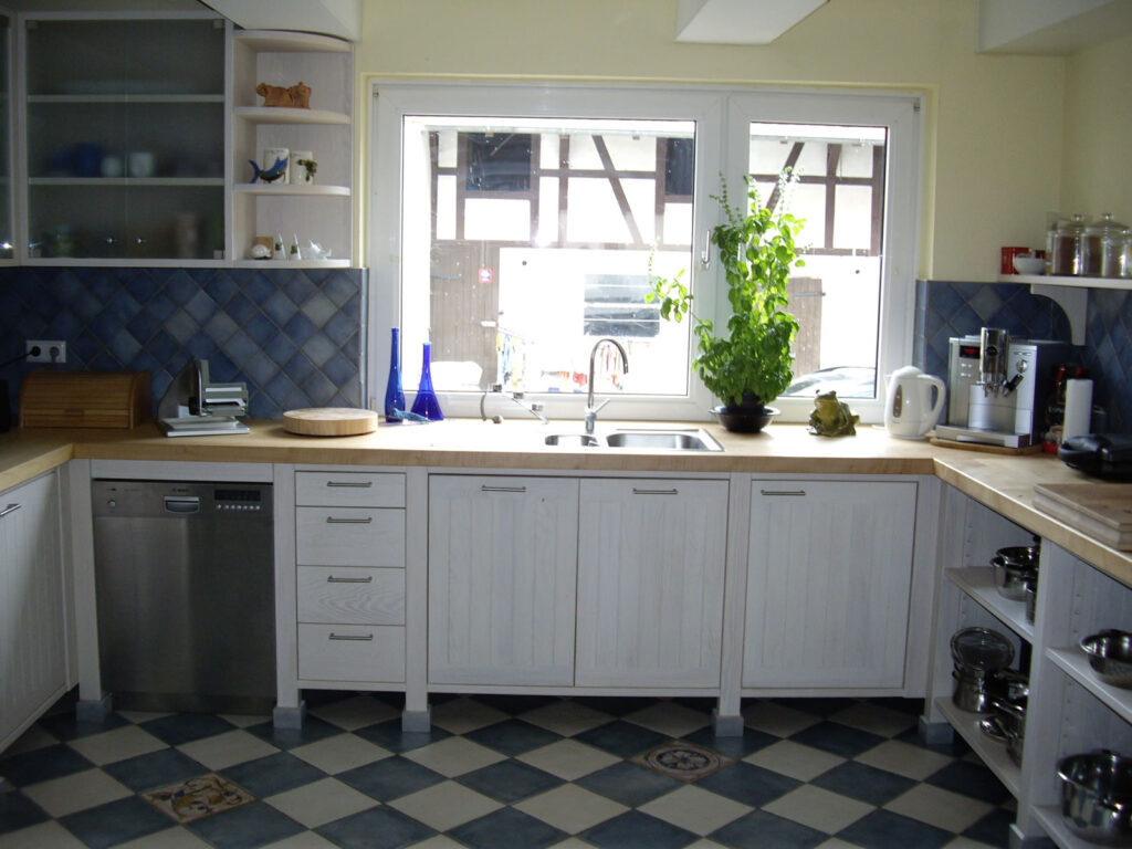 Diese große U-Form-Küche aus massiver Kiefer besticht durch ihre handwerkliche Qualität in Stollenbauweise mit Füllungen. Die gezapften Türrahmen mit Füllungen sorgen für Stabilität und ein elegantes Erscheinungsbild. Die Arbeitsplatte besteht aus durchgehenden, selbst hergestellten Ahornlamellen und ist mit einer transparenten Wachslasur veredelt.