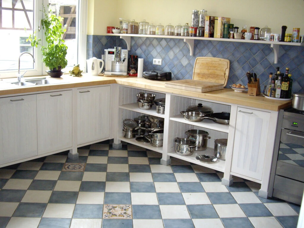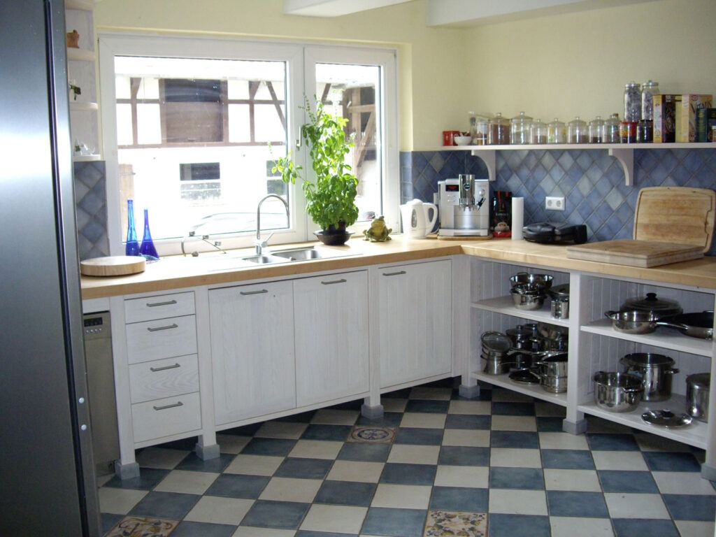 - Offene Fächer, ein integrierter Abfalleimer und Geschirrspüler sorgen für Funktionalität im Alltag.