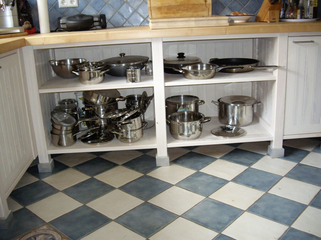 Die Kiefereinzelelemente sind mittels präziser Schwalbenschwanzverbindungen zusammengefügt. Ein offenes Element bietet Platz für Töpfe und Pfannen, mit verstellbaren Böden, die sich flexibel über Zahnleisten in der Höhe anpassen lassen. Verglaste Hängeschränke und ein offenes Wandregalbrett runden das natürliche Design ab.